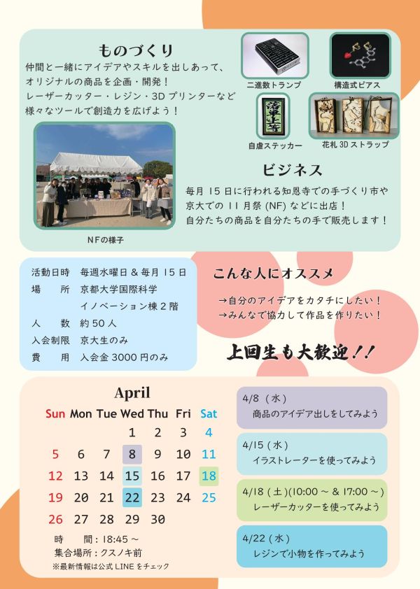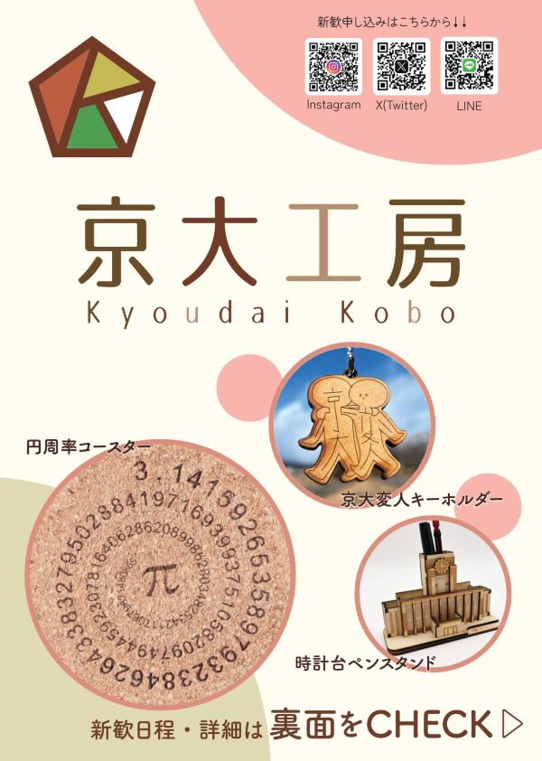 京大工房は、「学生の視点からアイデアをカタチに」を理念に京大らしいユニークな商品開発や販売を通して、ものづくりやビジネスについて実践的に学んでいく団体です。